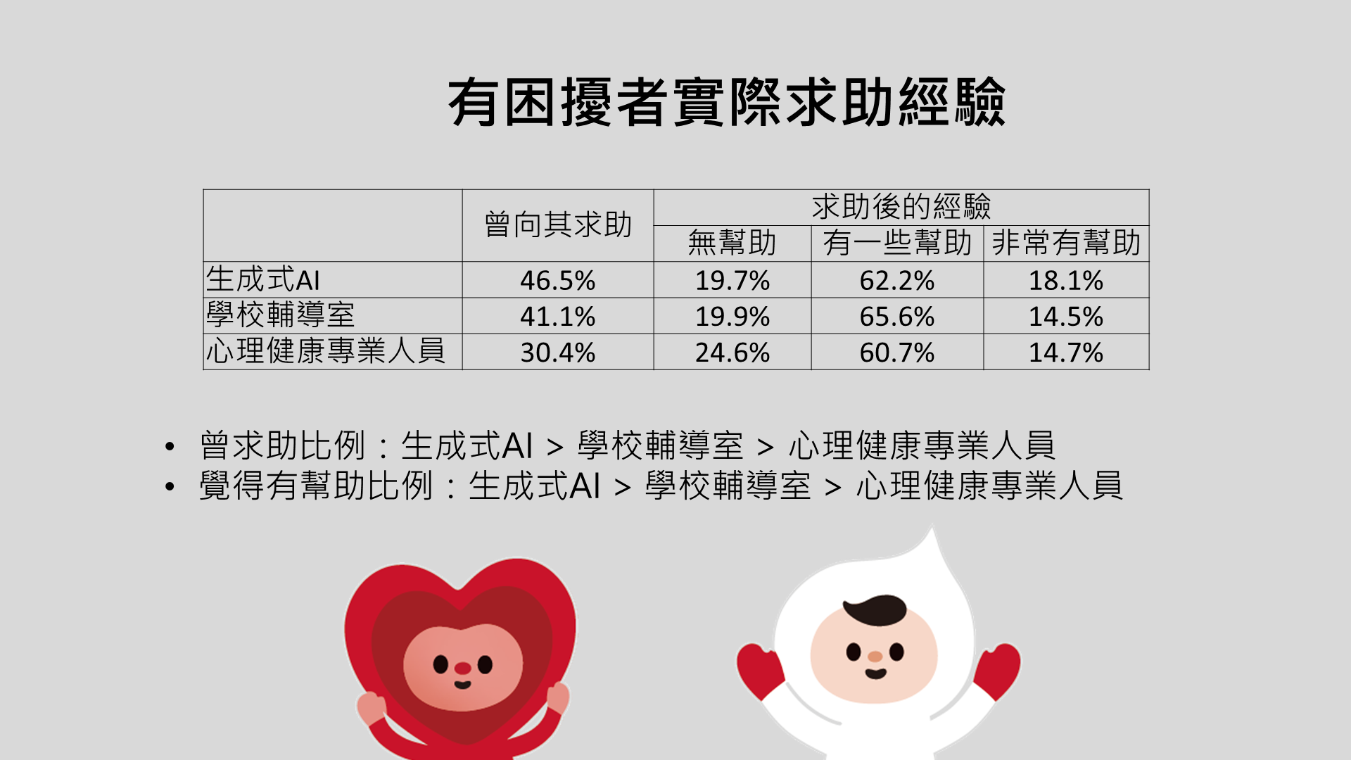 再進一步針對自陳有心理健康困擾的青少年,了解他們「實際求助經驗」,結果有46.5%曾求助AI、41.1%曾求助學校輔導室、30.4%曾求助心理健康專業人員。向AI求助比例更高於輔導資源或專業人士,可能和求助AI更具近便性有關。